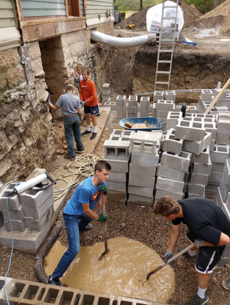 Thanks to many helping hands, the new basement door has been cut, a new sump has been placed, nearly all of the block has been laid for the new addition basement, and the exterior limestone wall of the existing basement has been pressure washed for sealant application. The concrete floor was set to be poured on Friday. Lots of work is getting done every day.